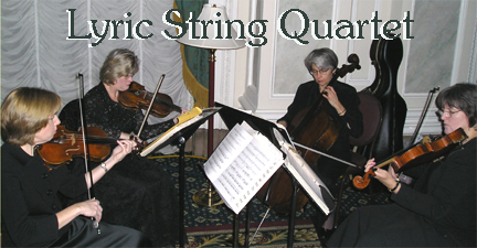 The Lyric String Quartet is an all female ensemble that has been playing together fifteen years. We play weddings, receptions, religious services, funerals, and other solemn and frivolous events. We are all classically trained musicians and amongst us we have played in the Richmond and Petersburg Symphonies and the Williamsburg Sinfonia. Our repertoire consists of late Baroque, early Classical muisc and quartet arrangements of more frequently asked wedding music. If requested, we engage a trumpeter to perform with us in weddings Our repertoire sheet is indicative but not inclusive of our entire repertoire. We offer two modes of dress: Concert black, which is black top and long black skirt; or a more European touch, white top and long black skirt. If in the event we must have a substitute musician and it is a gentleman, then he will wear a tuxedo. As contractor of the Quartet, I arrive one hour before we start to play. This is to assure that last minute changes go smoothly and communication with the wedding coordinator is facilitated. We do not attend wedding rehearsals. If there are any questions, please feel free to call me at 804.233.1642. Thank you, Jacquelin B. Spears jwbspears@aol.com |